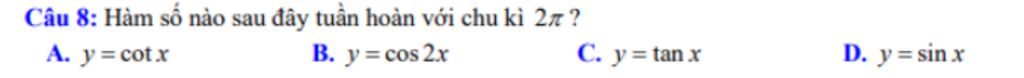 Hàm số `y=cotx` tuần hoàn theo chu kỳ `pi`