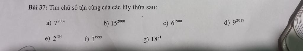 `to` Ta nhận thấy rằng sau mỗi lũy thừa, chữ số tận cùng lặp lại sau một chu kỳ gồm `4` số `(7, 9, 3, 1)`. Mà `2006` chia hết cho `4` $\Rightarrow$ chữ số tận cùng của $7^{2006}$ cũng là `1`