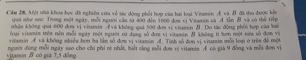 Câu 28. Một nhà khoa học đã nghiên cứu về tác động phối hợp của hai loại Vitamin A và B đã thu được kết
