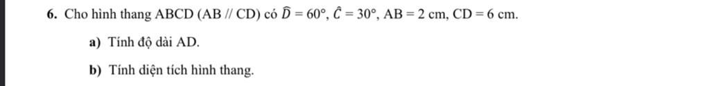 6. Cho hình thang ABCD (AB//CD) có hat D =60^ , hat C =30^ , AB = 2cm , CD = 6cm . a ) Tính độ dài AD. b) Tính diện tích hình thang.