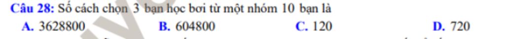 Số cách chọn `3` bạn học bơi từ nhóm `10` bạn là: `C_10^3=120`