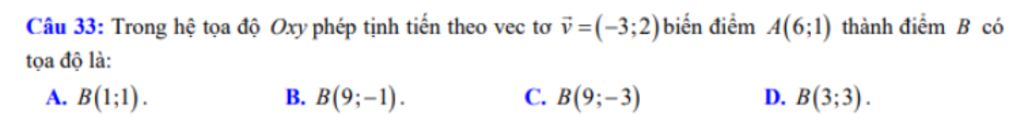 Câu 33: Trong hệ tọa độ Oxy phép tịnh tiến theo vec tơ $\overrightarrow{v}$=(-3;2)biến điểm 4(6;1) thành điểm B có tọa độ là: