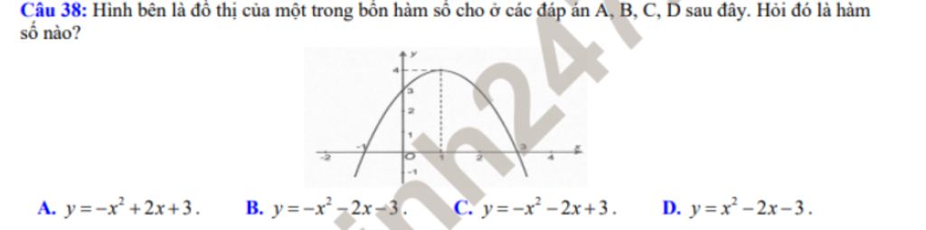 Câu 38: Hình bên là đô thị của một trong bốn hàm số cho ở các đáp án A, B, C, D sau đây. Hỏi đó là hàm
