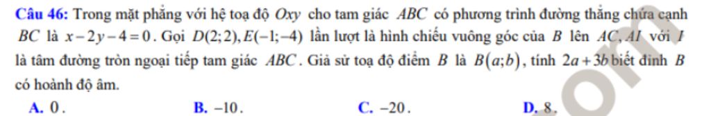 Câu 46: Trong mặt phẳng với hệ toạ độ Oxy cho tam giác ABC có phương trình đường thẳng chứa cạnh BC là $x–2y−4=0$. Gọi D(2;2),E(-1;–4) lần lượt là hình chiếu vuông góc của B lên AC,AI với I