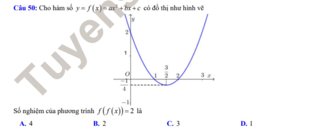 Giải thích các bước giải:f(f(x))=2 ----> nhìn đồ thị ta thấy coi f(x)=u ----> f(u)=2 có 2 nghiệm