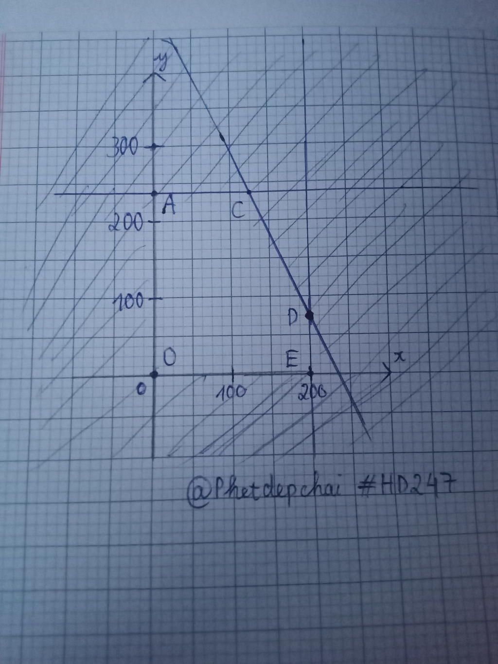 Dễ thấy biểu thức `T = 24x + 15y` có giá trị lớn nhất tại một trong các đỉnh của ngũ giác `ACDEO`