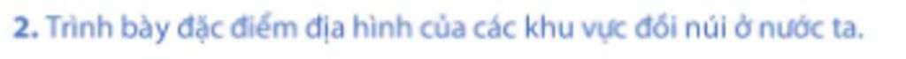 - Địa hình đồi núi nước ta chia thành bốn vùng là Đông Bắc, Tây Bắc, Trường Sơn Bắc và Trường Sơn Nam.