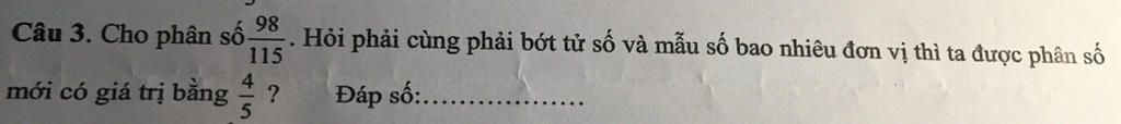 Hiệu giữa tử số và mẫu số của phân số `98/115` là `:`