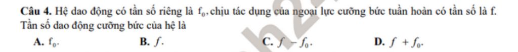 Câu 4. Hệ dao động có tần số riêng là fo,chịu tác dụng của ngoại lực cưỡng bức tuần hoàn có tần số là f. Tần số dao động cưỡng bức của hệ là