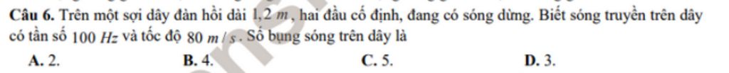 Câu 6. Trên một sợi dây đàn hồi dài 1,2 m, hai đầu cố định, đang có sóng dừng. Biết sóng truyền trên dây có tần số 100 Hz và tốc độ 80 m / s . Sổ bụng sóng trên dây là