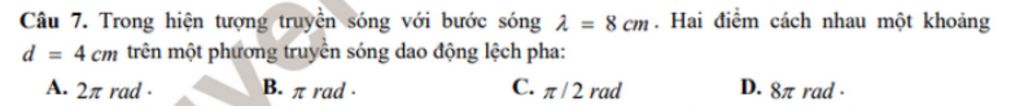 Câu 7. Trong hiện tượng truyền sóng với bước sóng $\lambda$ = 8 cm . Hai điểm cách nhau một khoảng d = 4 cm trên một phương truyền sóng dao động lệch pha: