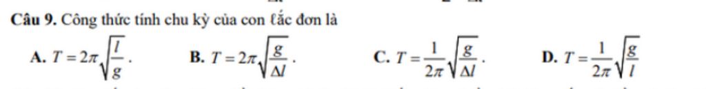 `-` Công thức tính chu kỳ của con lắc đơn là : `T=2pisqrt{l/g}`