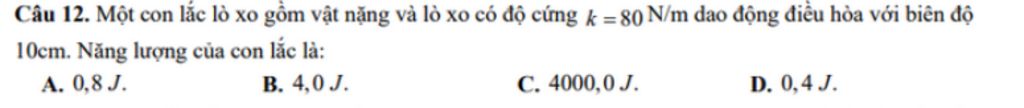 Câu 12. Một con lắc lò xo gồm vật nặng và lò xo có độ cứng k =80N/m dao động điều hòa với biên độ 10cm. Năng lượng của con lắc là:
