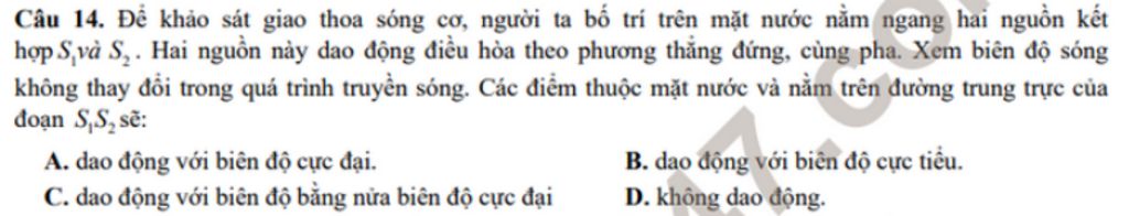 `-` Các điểm thuộc mặt nước và nằm trên đường trung trực của đoạn`S_1; S_2` có