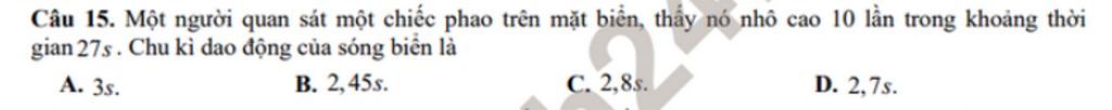 Câu 15. Một người quan sát một chiếc phao trên mặt biển, thấy nó nhô cao 10 lần trong khoảng thời gian 27s . Chu kì dao động của sóng biển là
