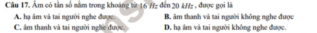 Câu 17. Âm có tần số nằm trong khoảng từ 16 Hz đến 20 kHz, được gọi là