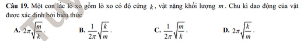 Chu kì dao động của vật được xác định bởi biểu thức là `2pi=sqrt{m/k}`
