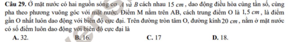 Do đường kính của đường trong tâm `O` là `20 →`hai nguồn nằm trong đường tròn nên số điểm dao động với biên độ cực đại trên đường tròn là `18` điểm