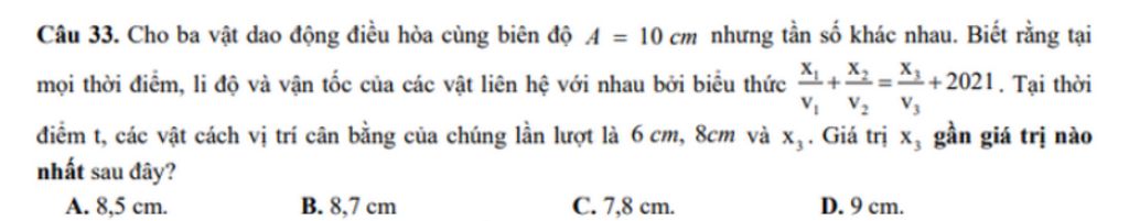 Câu 33. Cho ba vật dao động điều hòa cùng biên độ A = 10 cm nhưng tần số khác nhau. Biết rằng tại