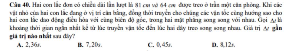Câu 40. Hai con lắc đơn có chiều dài lần lượt là 81 cm và 64 cm được treo ở trần một căn phòng. Khi các vật nhỏ của hai con lắc đang ở vị trí cân bằng, đồng thời truyền cho chúng các vận tốc cùng hướng sao cho hai con lắc dao động điều hòa với cùng biên độ góc, trong hai mặt phẳng song song với nhau. Gọi A là khoảng thời gian ngắn nhất kể từ lúc truyền vận tốc đến lúc hai dây treo song song nhau. Giá trị At gần giá trị nào nhất sau đây?