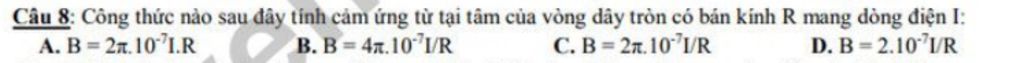 Công thức của tính cảm ứng từ tại tâm của vòng dây tròn có bán kính `R` mang dòng điện `I` là