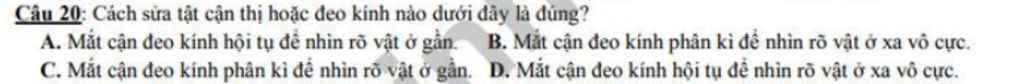 Câu 20: Cách sửa tật cận thị hoặc đeo kính nào dưới đây là đúng?
