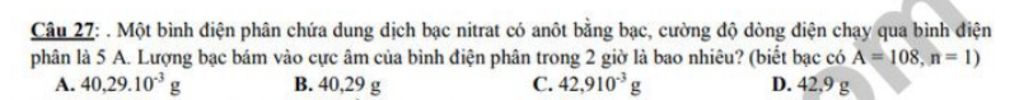 `m = 1/F . (A/n) . I.t = 1/96500 . (108/1) . 5.7200=40,29 g`