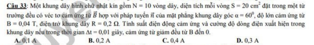 Câu 33: Một khung dây hình chữ nhật kín gồm N = 10 vòng dây, diện tích mỗi vòng S = 20 cm’ đặt trong một từ trường đều có véc tơ cảm ứng từ B hợp với pháp tuyến n của mặt phẳng khung dây góc a = 60, độ lớn cảm ứng từ B = 0,04 T, điện trở khung dây R = 0,2 Q. Tính suất điện động cảm ứng và cường độ dòng điện xuất hiện trong khung dậy nếu trong thời gian At=0,01 giây, cảm ứng từ giảm đều từ B đến 0.