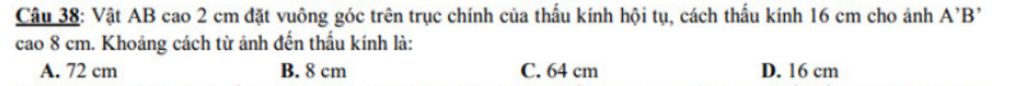 Câu 38: Vật AB cao 2 cm đặt vuông góc trên trục chính của thấu kính hội tụ, cách thấu kính 16 cm cho ảnh A’B’ cao 8 cm. Khoảng cách từ ảnh đến thấu kính là: