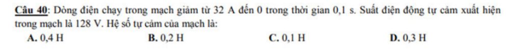 Câu 40: Dòng điện chạy trong mạch giảm từ 32 A đến 0 trong thời gian 0,1 s. Suất điện động tự cảm xuất hiện