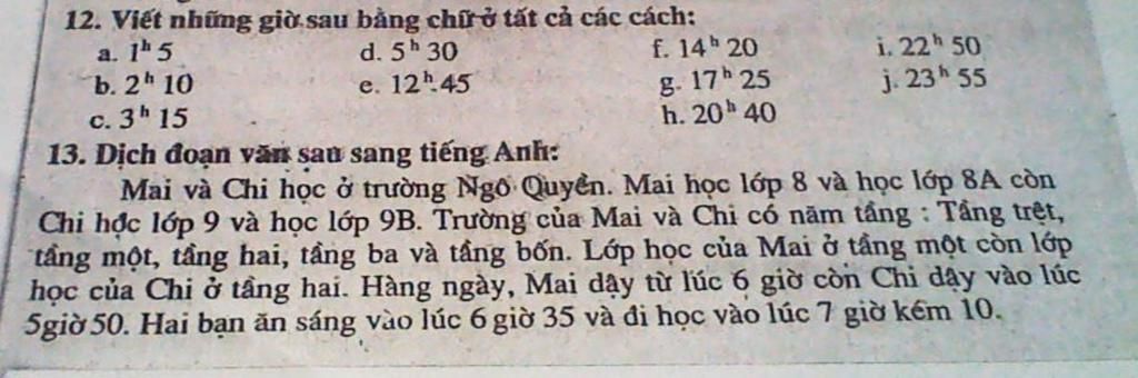 Mai and Chi study at Ngo Quyen school. Mai is in grade 8, class 8A and Chi is in grade 9, class 9B. Mai and Chi's school has five floor : ground floor, first floor, second floor, third floor and fourth floor. Mai's classroom is on first floor and Chi's classroom is on the second floor. Every day, Mai wakes up at 6 o'clock and Chi wakes up at five fifty. They eat breakfast at six thirdty-five and go to school at ten to seven