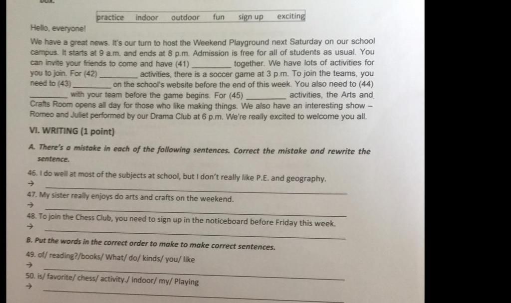 We have a great news. It’s our turn to host the Weekend Playground next Saturday on our school campus. It starts at 9 a.m. and ends at 8 p.m. Admission is free for all of students as usual. You can invite your friends to come and have (41) fun together. We have lots of activities for you to join. For (42) outdoor activities, there is a soccer game at 3 p.m. To join the teams, you need to (43) sign up on the school’s website before the end of this week. You also need to (44) practice with your team before the game begins. For (45) indoor activities, the Arts and Crafts Room opens all day for those who like making things. We also have an interesting show – Romeo and Juliet performed by our Drama Club at 6 p.m. We’re really excited to welcome you all.