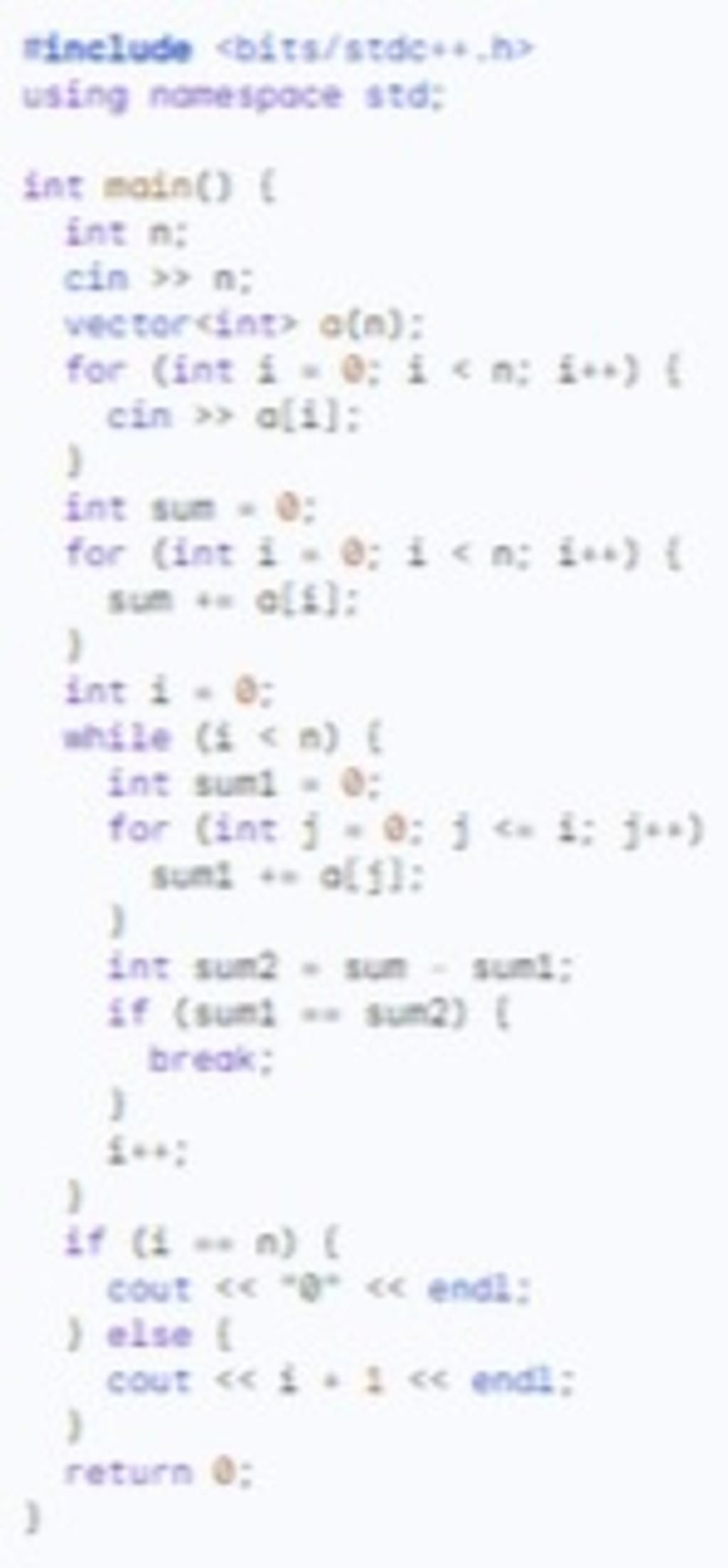 #include <bits/stdc++.h> using namespace std; int main() { int n; cin >> n; vector<int> a(n); for (int i = 0; i < n; i++) { cin >> a[i]; } int sum = 0; for (int i = 0; i < n; i++) { sum += a[i]; } int i = 0; while (i < n) { int sum1 = 0; for (int j = 0; j <= i; j++) { sum1 += a[j]; } int sum2 = sum - sum1; if (sum1 == sum2) { break; } i++; } if (i == n) { cout << "0" << endl; } else { cout << i + 1 << endl; } return 0; } Rút gọn#include <bits/stdc++.h> using namespace std; int main() { int n; cin >> n; vector<int> a(n); for (int i = 0; i < n; i++) { cin >> a[i]; } int sum = 0; for (int i = 0; i < n; i++) { sum += a[i]; } int i = 0; while (i < n) {... xem thêm