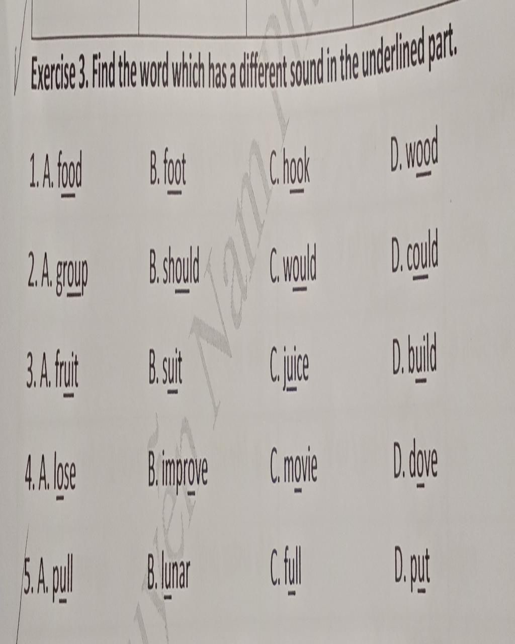 `3.` `D` `(`phát âm là âm /ɪ/ còn lại âm /u:/`).`