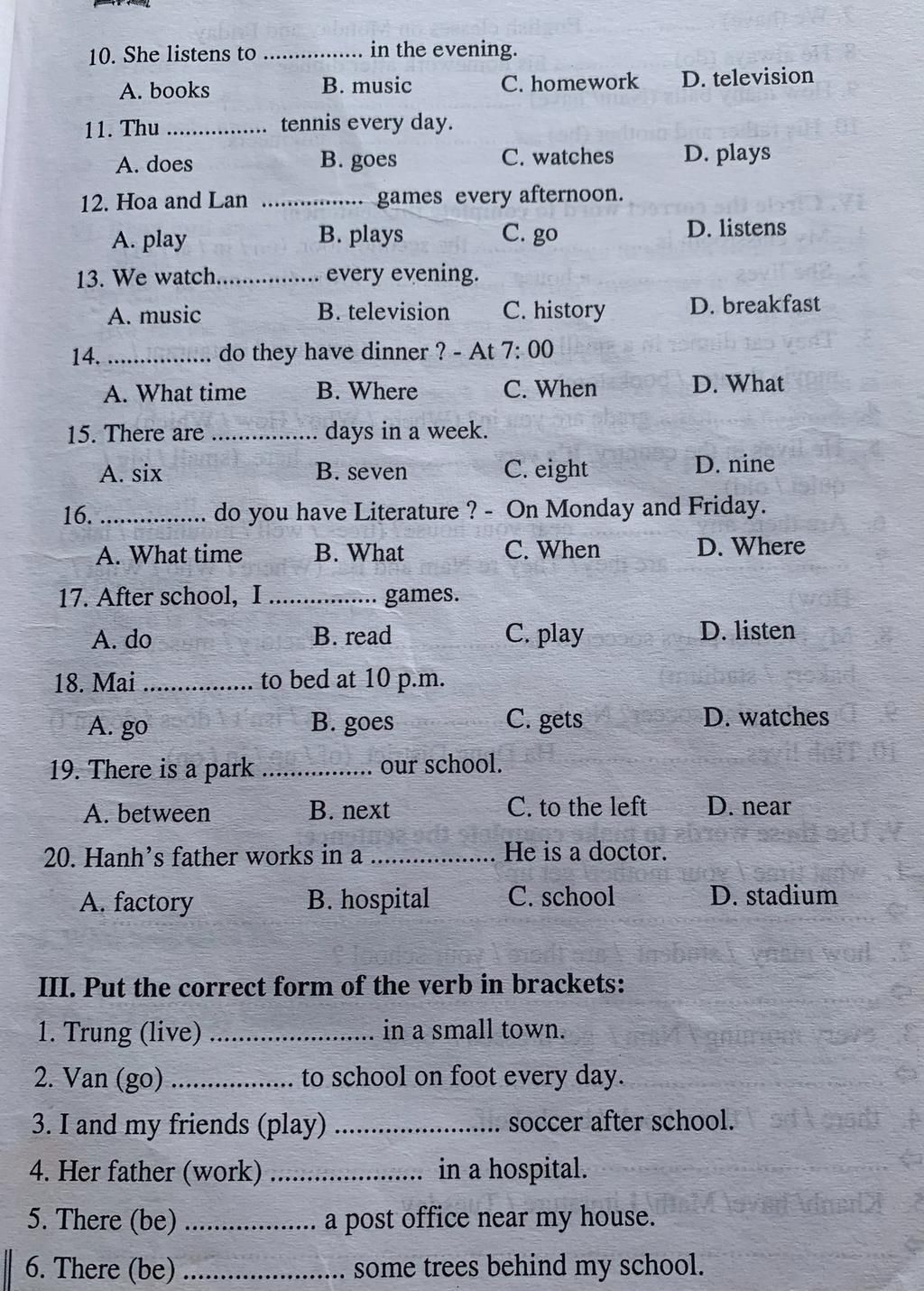 20) hospital ( bố là bác sĩ nên nơi lm vc là bệnh viện nên phải chọn hospital