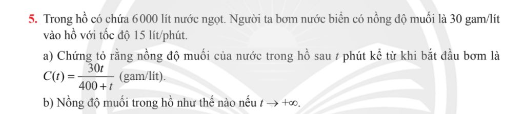 5. Trong hồ có chứa 6000 lít nước ngọt. Người ta bơm nước biển có nồng độ muối là 30 gam/lít