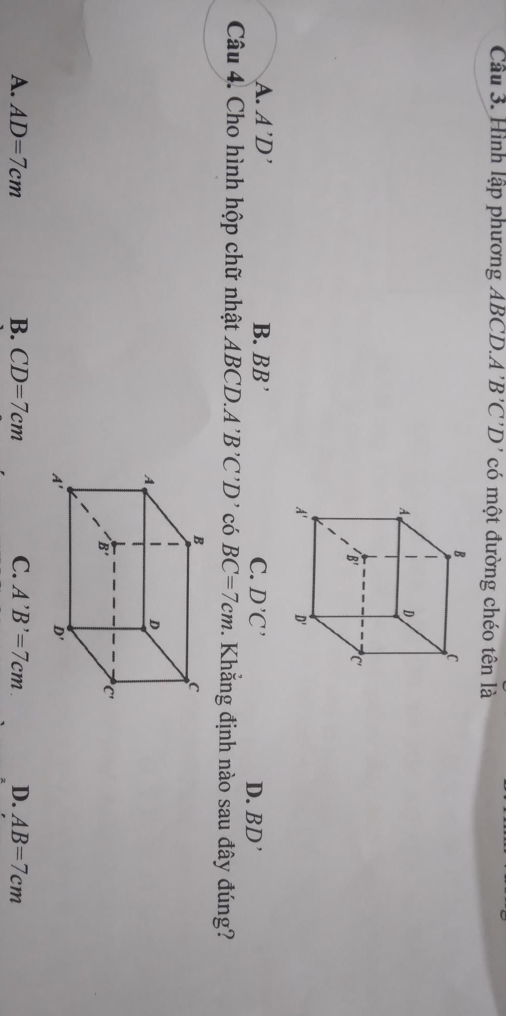 Câu 4. Cho hình hộp chữ nhật ABCD.A’B’C’D’ có BC=7cm. Khẳng định nào sau đây đúng?