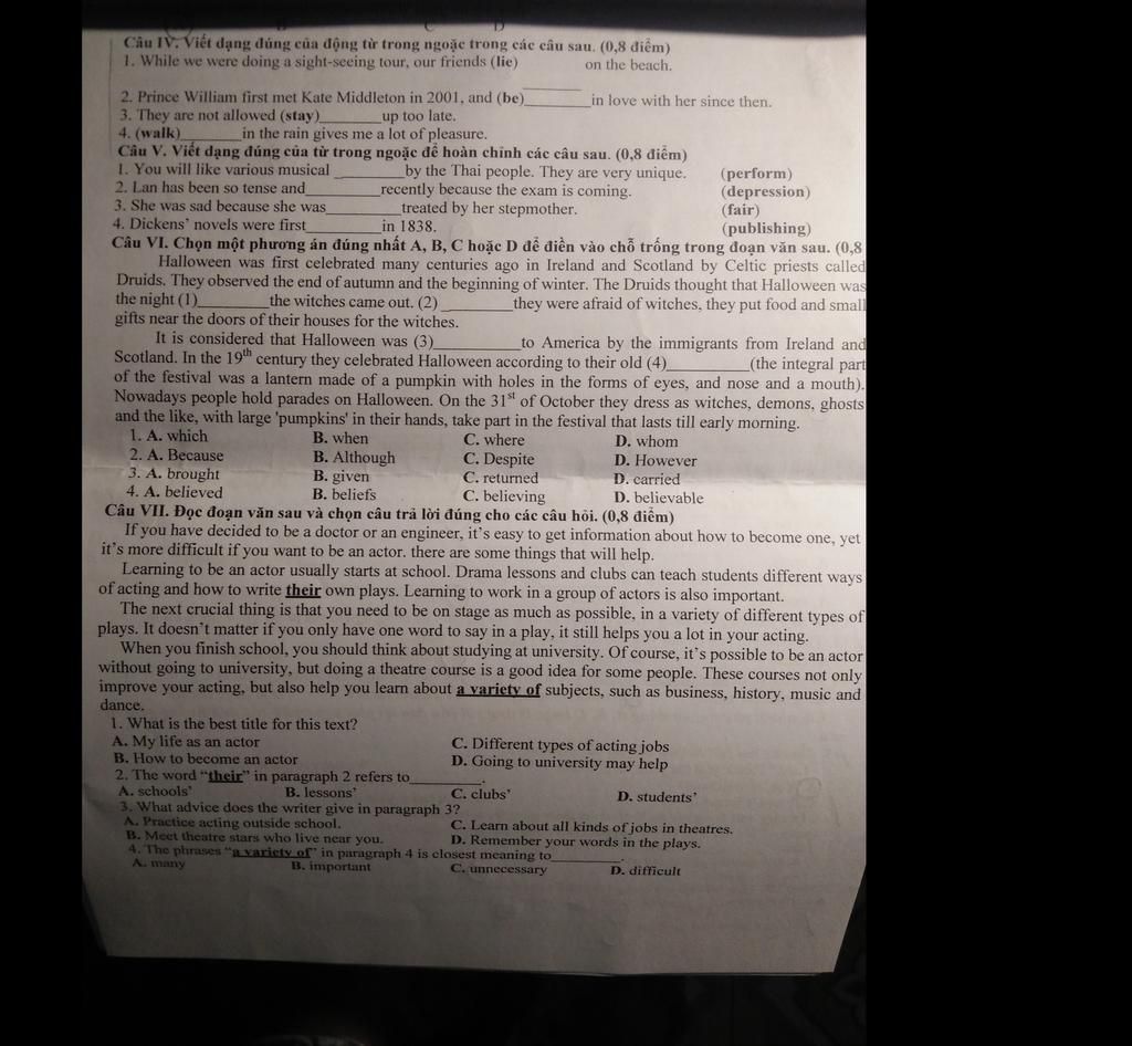 Câu IV. Viết dạng dúng của động từ trong ngoặc trong các câu sau: (0,8 điểm)