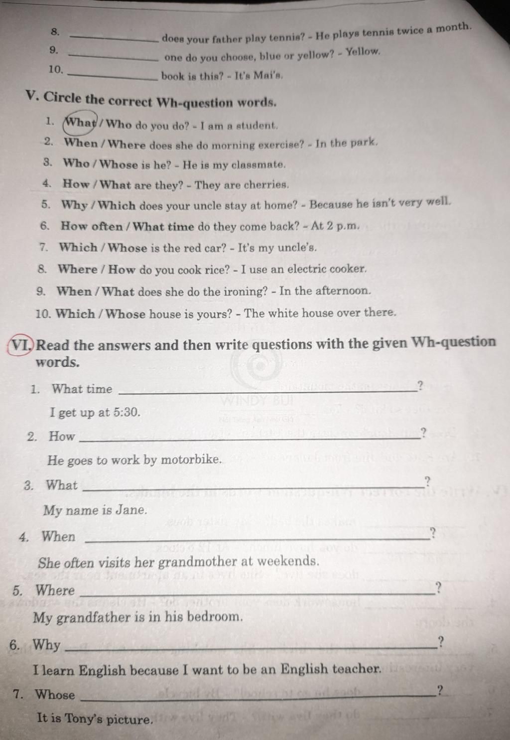 V. Circle the correct Wh-question words.