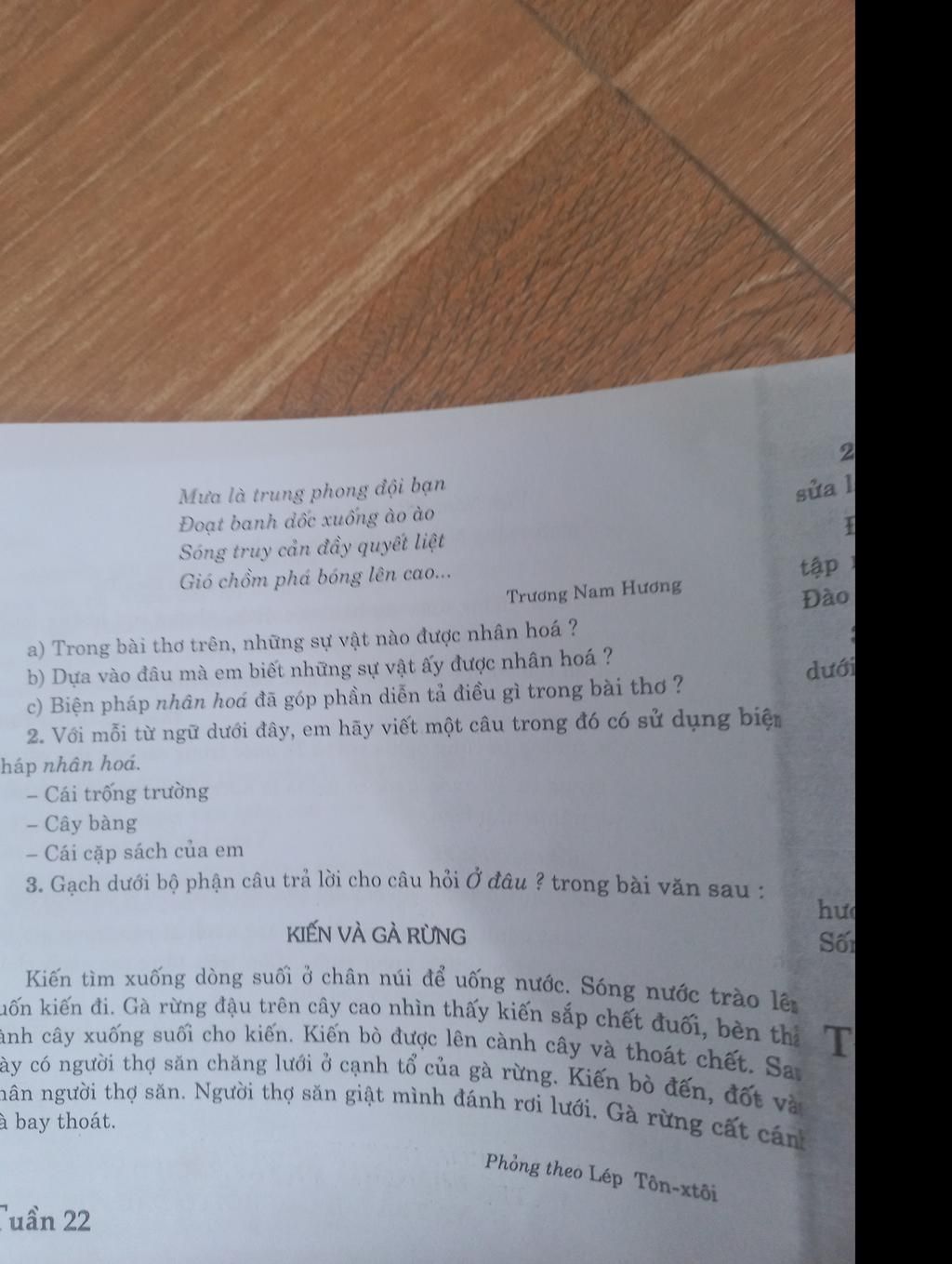 `b)` `->` Tác giả đã nhân hoá những sự vật trên bằng cách dùng những từ ngữ chỉ tên gọi, hoạt động thường tả người để tả ông trời, gió, mưa, sóng.