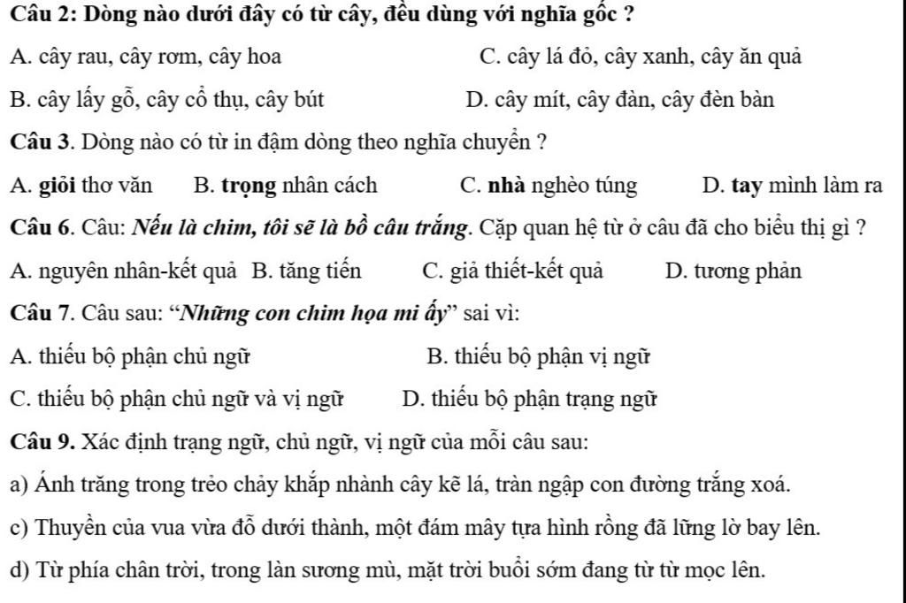 Vì phương án C chỉ loại cây là nghĩa gốc còn các phương án khác là nghĩa chuyển
