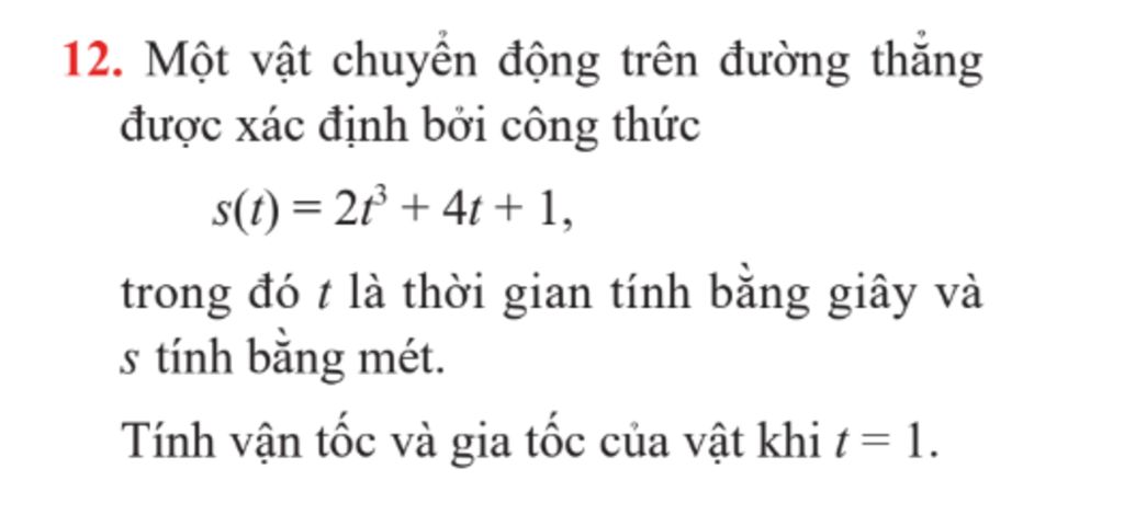 12. Một vật chuyển động trên đường thẳng được xác định bởi công thức s(t) = 2t³ + 4t + 1, trong đó t là thời gian tính bằng giây và s tính bằng mét. Tính vận tốc và gia tốc của vật khi t=1.