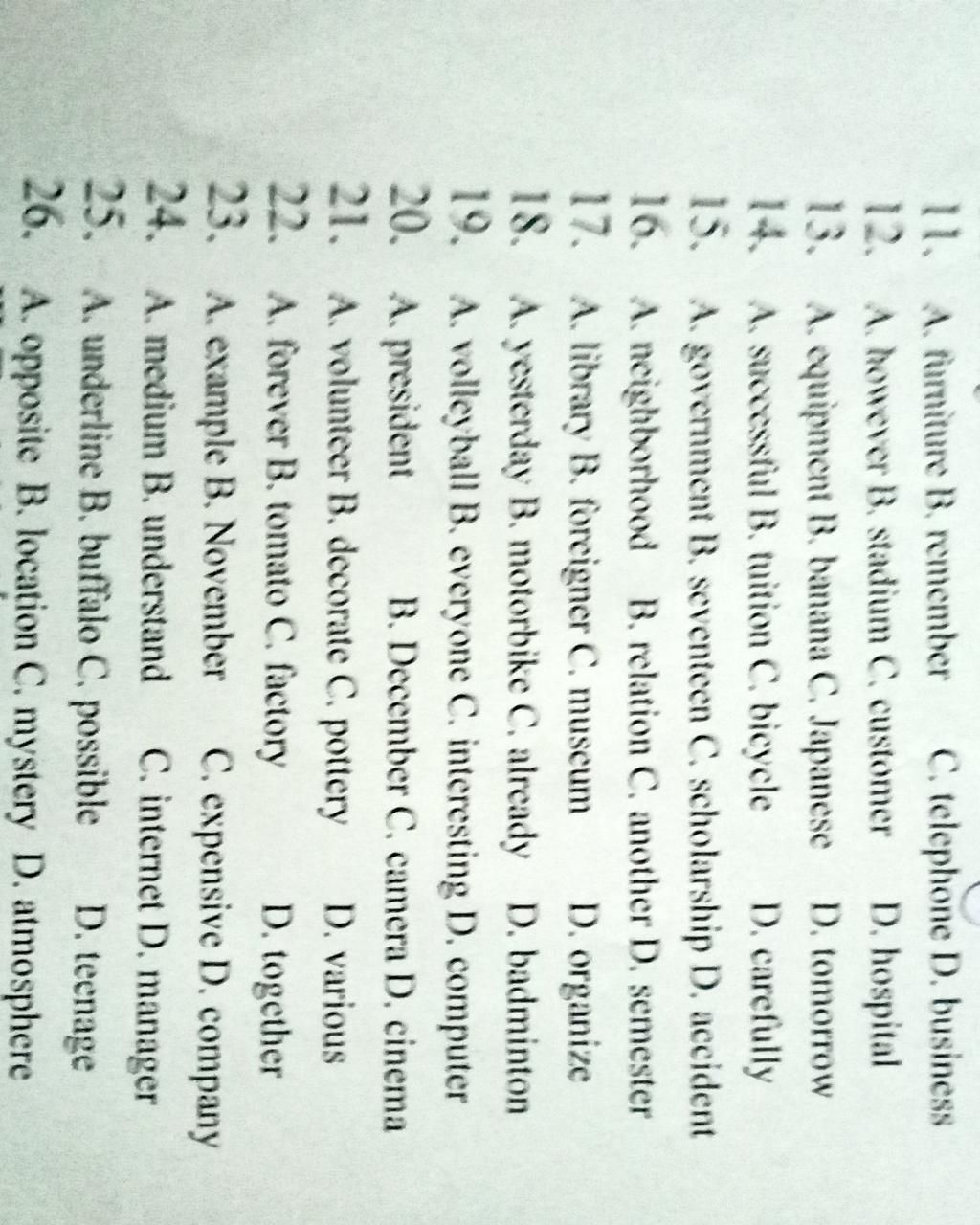 12. B, C, D là dt nên trọng âm rơi vào âm tiết đầu; A. however có trọng âm là /haʊ'ev(ə)r/ rơi vào âm thứ 2.