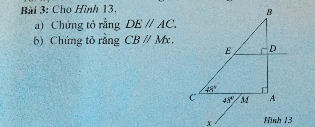 Ta có: `{(DE ⊥ AB),( AC ⊥ AB):} ⇒ DE //// AC` `(` Tính chất giữa vuông góc và song song `)`