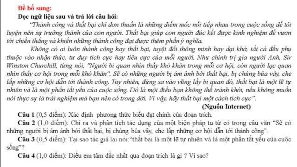 Câu 1: Phương thức biểu đạt chính của đoạn trích là miêu tả và luận bàn về vai trò của thất bại trong cuộc sống và cách nhìn nhận của mỗi người về thành công và thất bại.