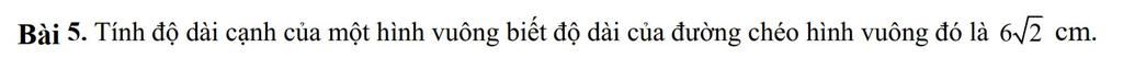 Giải thích các bước giải: gọi cạnh hình vuông là a, do các cạnh hình vuoogn bằng nhau nên ta có a^2 +a^2=(6 căn 2 )^2 có nghia x là 2a^2=72 <=> a^2=36 => a =6