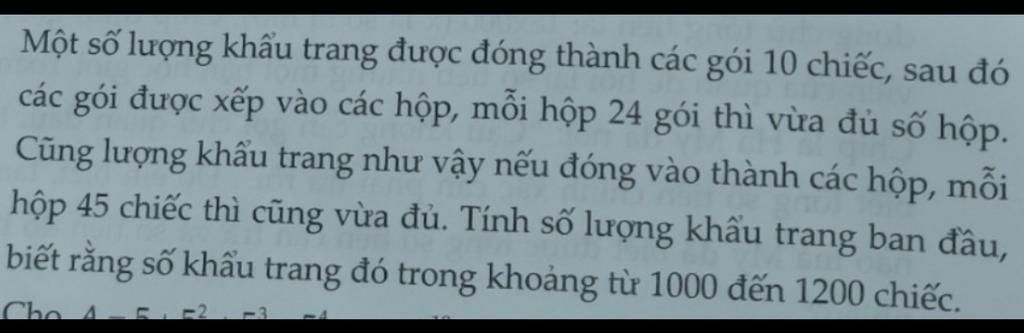 Gọi số lượng khẩu trang ban đầu là $x, (1000\le x\le 1200, x\in N)$