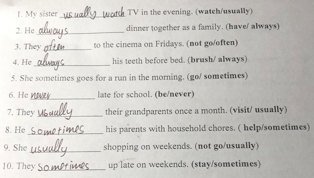 `@` Dấu hiệu nhận biết: usually, every day/ week/ month..., always, often, occasionally, seldom, never, rarely, once/ twice/ three times/ four times... a day/ week/ month/ year…, hardly...