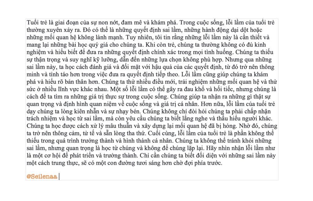 Lỗi lầm của tuổi trẻ là điều không thể tránh khỏi. Biết đứng dậy sửa chữa lỗi lầm mà bản thân gây ra mới là điều mà mỗi cá nhân cần cần quan tâm. Lỗi lầm của tuổi trẻ là những quyết định, hành động,... mà mỗi cá nhân thực hiện, lựa chọn nhưng lại mang tính sai trái, chưa đúng với chuẩn mực hoặc không đem lại kết quả mong muốn khi còn trẻ. Tuổi trẻ là của bạn, cuộc sống là của bạn. Tuổi trẻ có quyền được thử nghiệm, trải nghiệm, được quyền sống theo ước mơ và có quyền sửa sai. Chính vì vậy, hãy sống hết mình và biết lắng nghe, biết học hỏi từ những sai lầm. Bạn có quyền lựa chọn cách sống của mình, có quyền thay đổi, có quyền vấp ngã và đứng dậy sau những khó khăn. Lỗi lầm của tuổi trẻ cũng có thể coi như là một loại tài sản. Càng va chạm nhiều với cuộc sống, sẽ càng nhận ra nhiều khiếm khuyết, sai lầm. Từ việc nhận thức được những khiếm khuyết, sai lầm đó chúng ta có cơ hội để tự điều chỉnh mình, hoàn thiện bản thân và có cơ hội trở thành một người hoàn hảo hơn. Phía sau những lần mắc lỗi luôn có những điều đúng đắn chờ đợi chúng ta, những điều lớn lao hơn, tốt đẹp hơn. Với tuổi trẻ, sai lầm đôi khi còn là một lợi thế. Tuổi trẻ có quyền được thử nghiệm, trải nghiệm, được phép sai và sửa sai. Sẽ không có thành công nếu chưa từng trải qua sai lầm. Trong cuộc sống có vô vàn những con người dù có mắc sai lầm khi còn trẻ. Những con người không dám đối mặt với lỗi lầm của tuổi trẻ, không dám đứng dậy sửa sai mới là những kẻ đáng phê phán và lên án. Bản thân tôi cũng là một chồi non mang mầm sống mãnh liệt, tôi luôn tự nhủ rằng bản thân cần sửa sai sau những lỗi lầm của tuổi trẻ để học được những điều quý báu. Đừng bao giờ đánh mất đi đặc quên của bản thân khi còn trẻ đó là được phép sai lầm. Sai ở đâu thì đứng dậy sửa sai ở đó. Đó mới chính là cốt lõi của những điều quý giá trong cuộc sống.