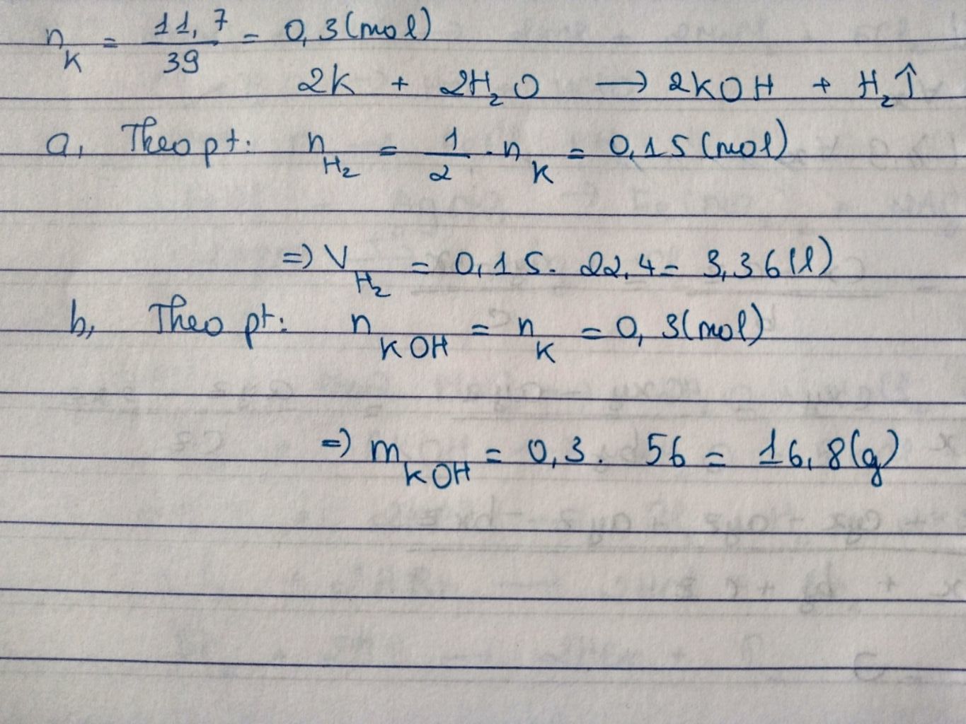 $nK = m/M = 11,7/39 = 0,3 (mol)$